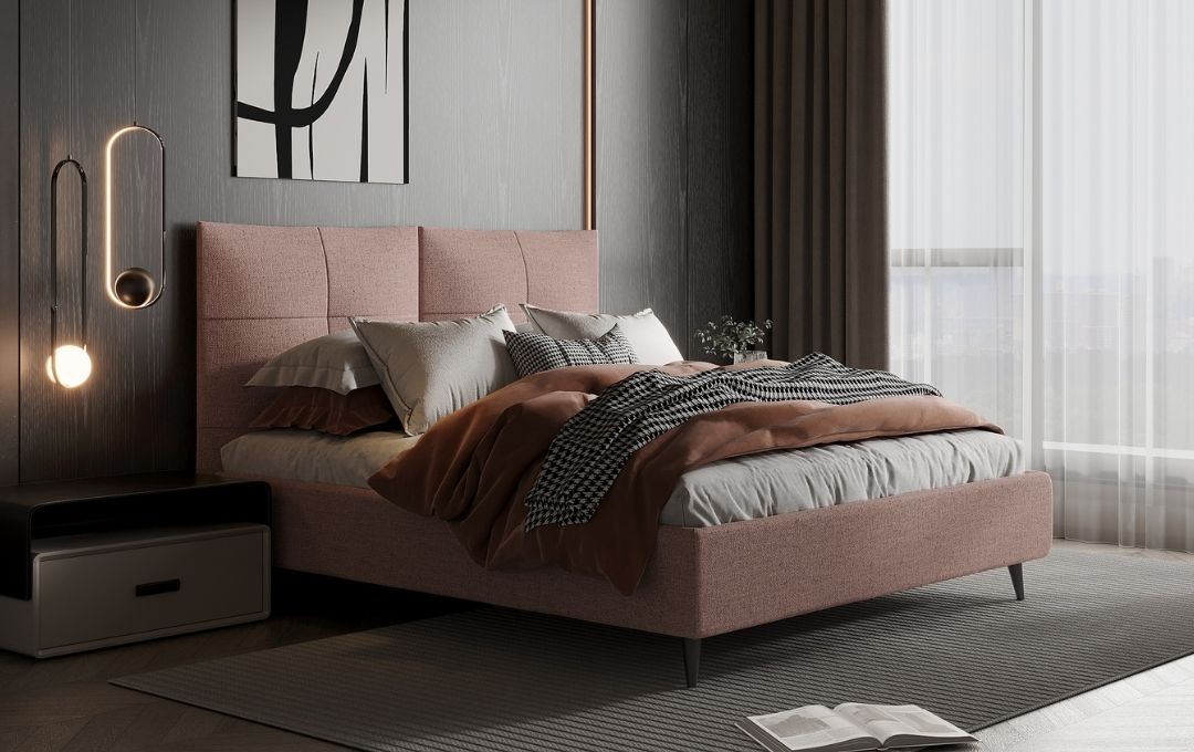 The Viola Veradea upholstered bed stands out for its elegant double-padded headboard panels, designed to enhance comfort and add a refined touch to your bedroom. The geometric stitching creates a soft, harmonious line that makes the bed both visually appealing and inviting. Every detail turns the Viola bed into a true statement piece, perfectly suited for both classic and modern interiors. This model features a spacious storage compartment to meet various needs. It comes with 13 cm high charcoal-colored plastic feet and a lift-up slatted mechanism. A wooden slatted bed base is included to ensure comfort and support.