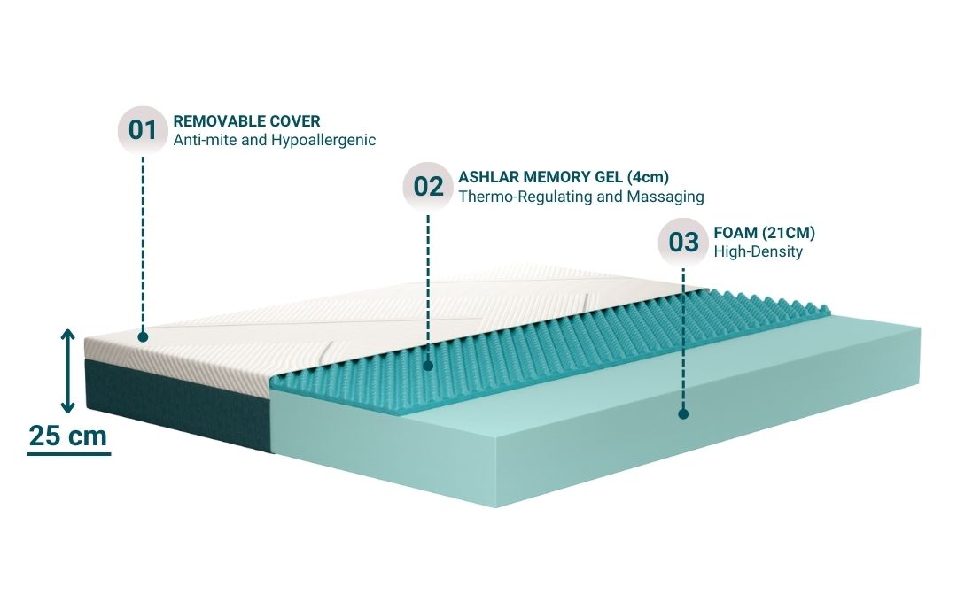 Veradea’s Memory Gel mattress is the perfect choice if you want to sleep with a good rigid support. Made in foam and memory gel, this mattress is designed to guarantee the perfect alignment of your spine and the right support for every part of your body. Thanks to the massaging effect of its ashlar surface, this foam mattress combines the rigidity of high-density foam and the comfort of memory gel. A Class 1 Medical Device, 100% Made in Italy, and OEKO TEX 100 certified.