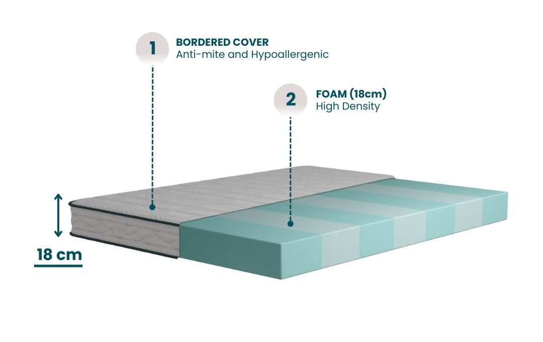 The Primo Veradea mattress is the solution with the best quality-price ratio, suitable for any need, without compromising the quality of a handcrafted product. With its 18 cm height, the Primo Veradea mattress is made of a single high-density foam layer, providing firm and comfortable support. Its bordered stitching ensures durability, and the quilted effect offers a comfortable and peaceful rest. 100% Made in Italy, it is a Class 1 Medical Device and is OEKO-TEX 100 certified.